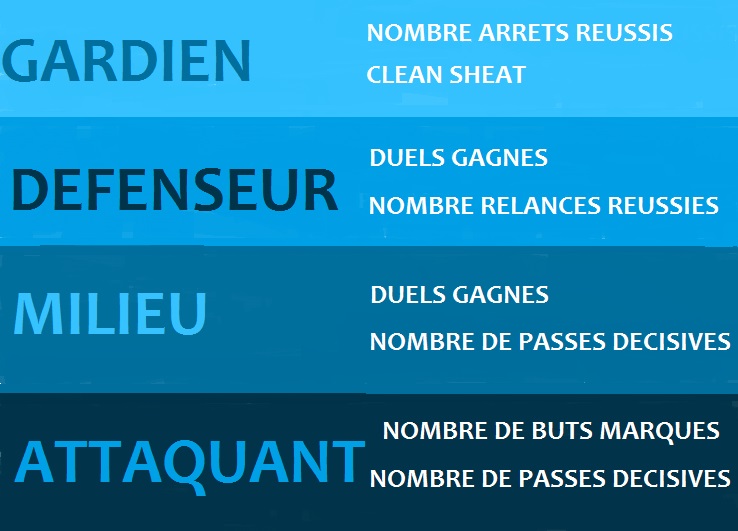 Les gardiens seront ainsi évalués en premier, sur le nombre d’arrêts réussis et les clean sheat en seconde instance. Les Défenseurs, duels gagnés en premier, nombre de relances réussies en second, les milieux, duels gagnés en premier et nombre de passes décisives en second et pour finir, les attaquants, nombre de buts en premier et nombre de passes décisives en second.